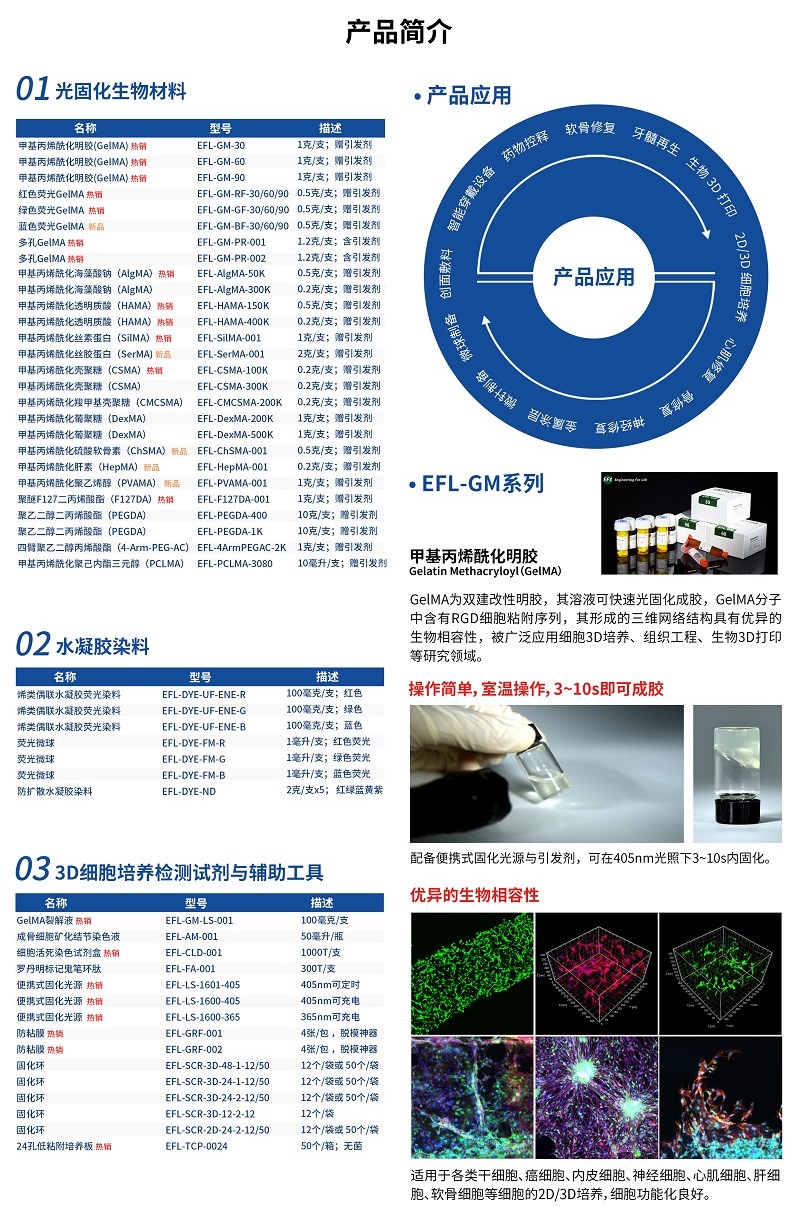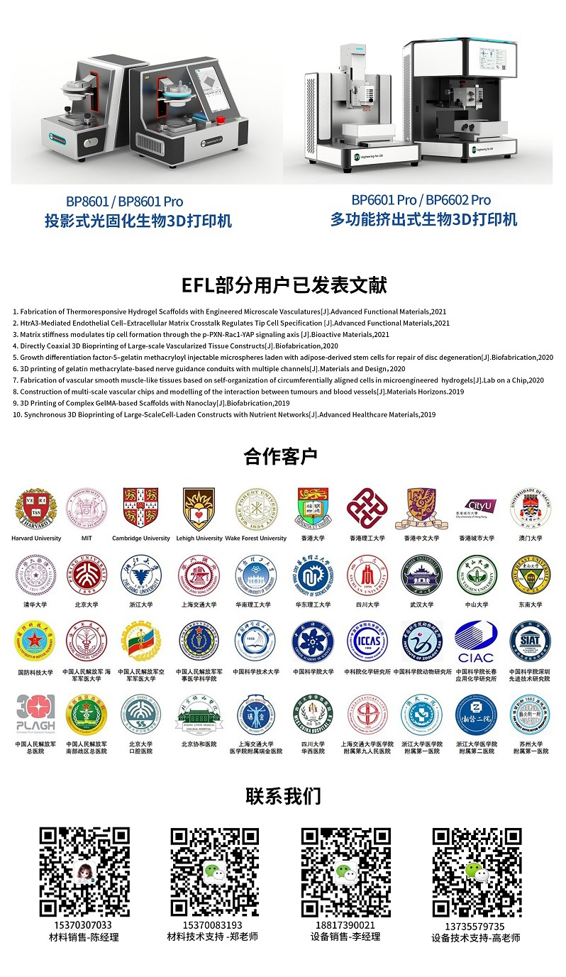 EFL創(chuàng)立于2017年,是以浙江大學(xué)生物制造實(shí)驗(yàn)室科研成果為基礎(chǔ)進(jìn)行產(chǎn)業(yè)轉(zhuǎn)化,致力于顛覆再生醫(yī)學(xué)領(lǐng)域的基礎(chǔ)耗材、器件及設(shè)備由國外壟斷的現(xiàn)狀,研發(fā)原創(chuàng)的生物耗材及裝備。EFL現(xiàn)已建立系列生物試劑耗材的量化生產(chǎn)線,并推出了10余種系列光固化生物材料(GelMA系列、HAMA系列、SilMA系列、CSMA系列、ChsMA系列等),提供整套細(xì)胞3D培養(yǎng)(材料、輔助工具、檢測試劑)、微針制備(材料、模具、裝置)、生物3D打印(墨水、系列生物3D打印機(jī)、技術(shù)服務(wù))等解決方案,EFL產(chǎn)品已服務(wù)哈佛、劍橋、清華、北大、浙大等國內(nèi)外數(shù)百個科研單位,近2000個課題組,深受國內(nèi)外科研人員與合作企業(yè)的好評與認(rèn)可。